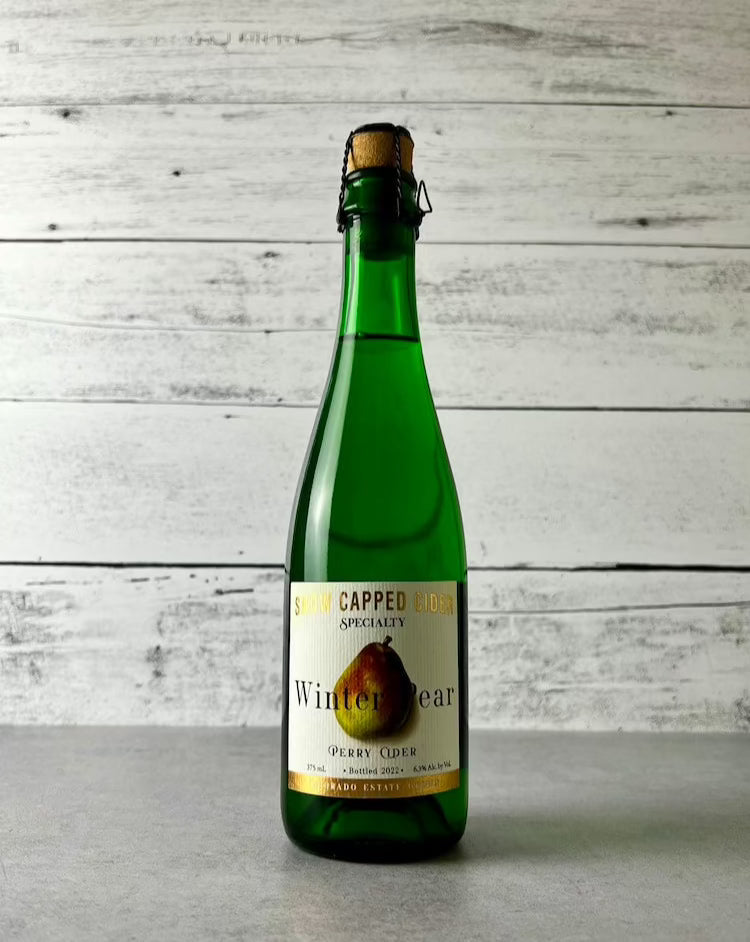 Snow Capped Cider's Winter Pear Perry is made from a blend of D'anjou, Bosc, Comice, and winter pears handpicked from 70-year-old Colorado pear trees. Winter pears are stored 3-5 weeks to adequately ripen, then juiced and fermented cold and slow and returned to cold storage for aging. The journey ends with bold carbonation and delicate soft pear sweetness. Notes of juicy ripe pear, vanilla, strawberry, and twig, with light floral notes and a super soft mouthfeel of tiny bubbles.